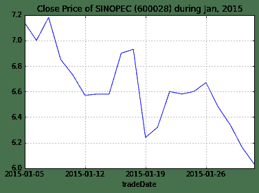 pandas数据直接可以绘图查看,下例中我们采用中国石化一月的收盘价进行绘图,其中set_index('tradeDate')['closePrice']表示将DataFrame'tradeDate'这一列作为索引,将'closePrice'这一列作为Series的值,返回一个Series对象,随后调用plot函数绘图,更多的参数可以在matplotlib的文档中查看。