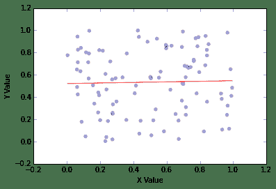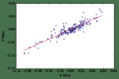 plt.plot(X2, Y_hat, 'r', alpha=0.9); # Add the regression line, colored in red
