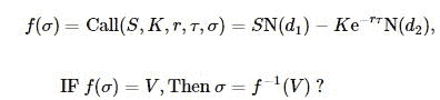 作为BSM期权定价最重要的参数,波动率σ是标的资产本身的波动率。是我们更关心的是当时的报价所反映的市场对波动率的估计,这个估计的波动率称为隐含波动率(Implied Volatility)。这里的过程实际上是在BSM公式中,假设另外4个参数确定,期权价格已知,反解σ: