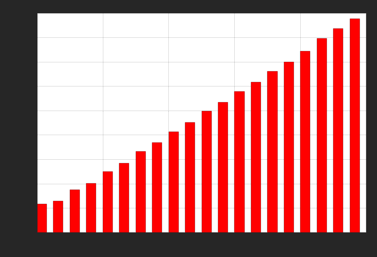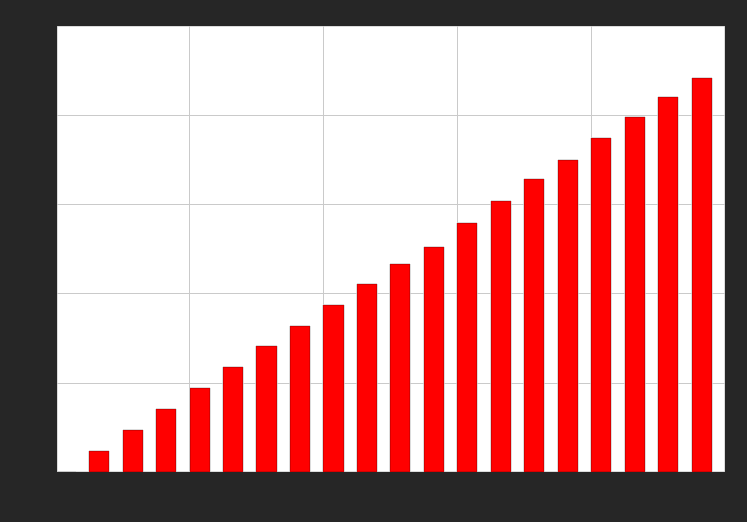 pylab.bar(portfolioSize, timeSpentNumpy, color = 'r', width = 300)
