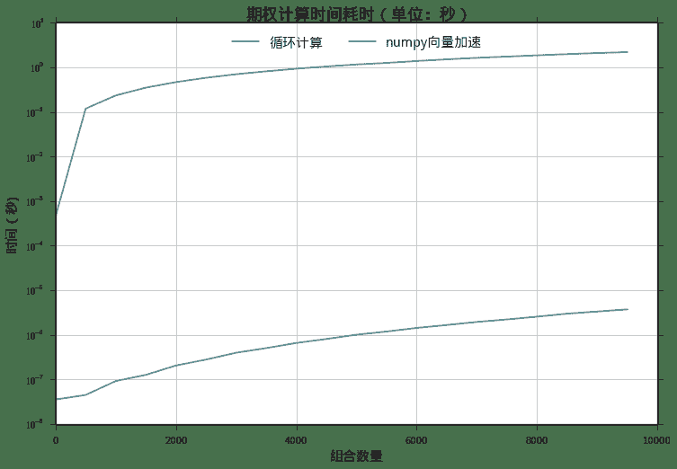 pylab.title(u'期权计算时间耗时(单位:秒)- numpy加速版', fontproperties = font, fontsize = 18)