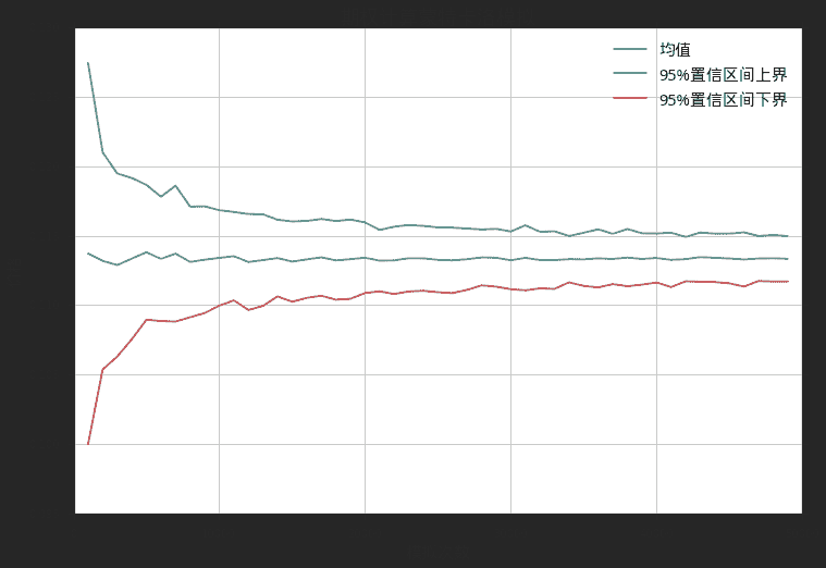 蒙特卡洛方法会有收敛速度的考量。这里我们可以看到随着模拟次数的上升,仿真结果的置信区间也在逐渐收敛。