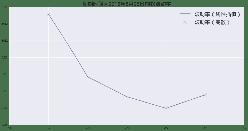 选取某一个到期时间上的波动率点,看一下插值的效果。这里我们选择到期时间最近的点:2015年3月25日: