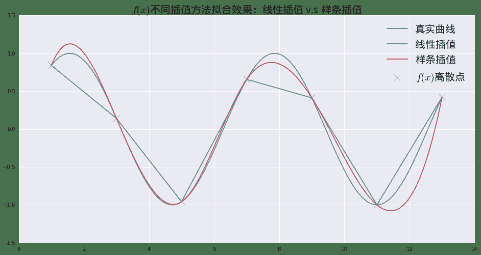 pylab.legend([u'真实曲线', u'线性插值', u'样条插值', u'$f(x)$离散点'], prop = font)