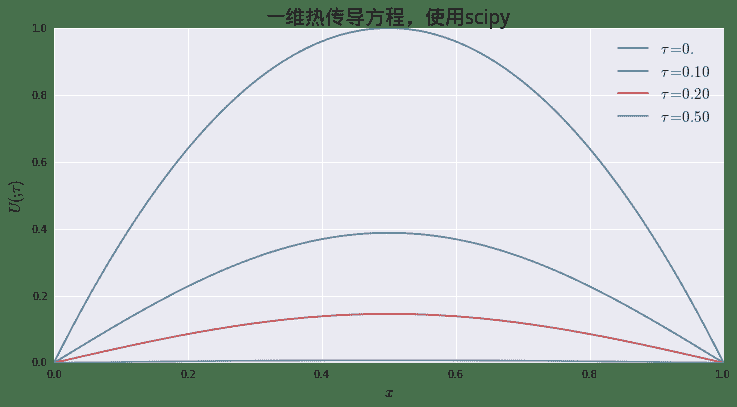 plotLines([U[:,0], U[:, int(0.10/ dt)], U[:, int(0.20/ dt)], U[:, int(0.50/ dt)]], xArray, title = u'一维热传导方程,使用scipy', xlabel = '$x$',