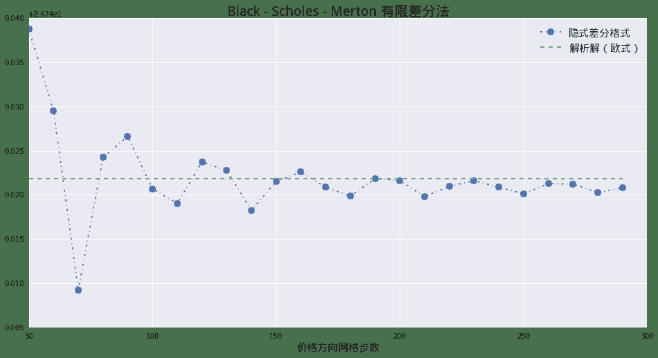 pylab.legend([u'隐式差分格式', u'解析解(欧式)'], prop = font)