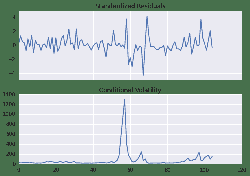 下面的图标,展示了标准化后的新息和条件波动率的情况。可以看出,虽然进行了标准化处理,一些位置还是出现了较大的误差(通过振幅来看)