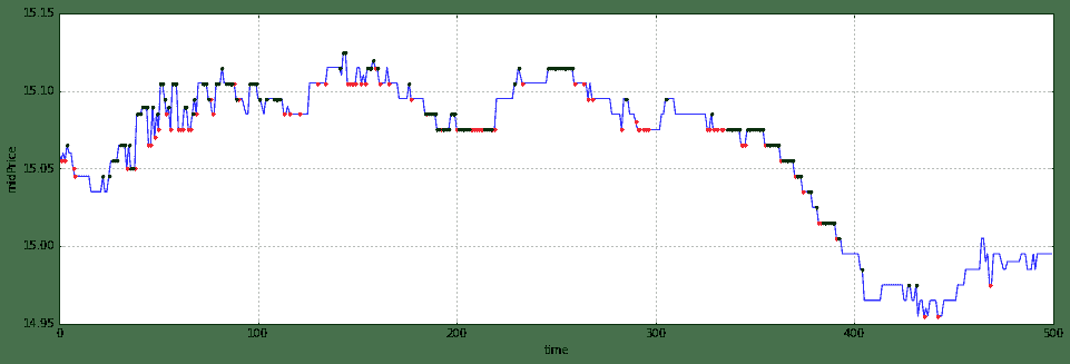 我这里拿了11月30日的万科A作为数据来源来预测。之所以拿万科A,是因为我从11月上旬就开始看好这只股票,结果在中旬的时候没有拿住,低位没有补进,谁知道月底就起飞了,让我又爱又恨。我在最后画出了预测结果,蓝线是测试集中的mid price时间序列,红点表示模型预测下一时刻方向向上,绿点表示模型预测下一时刻方向向下,没有画点表示预测方向不变。