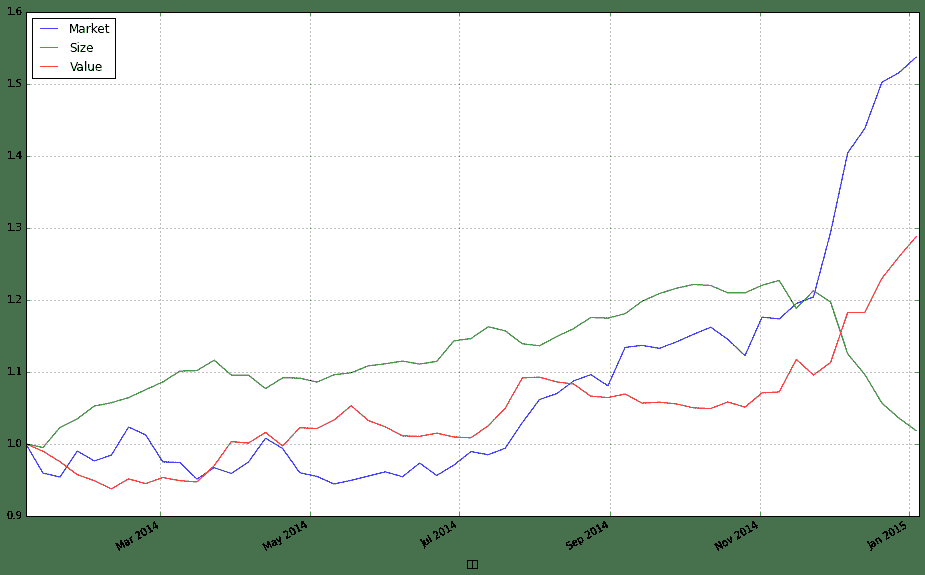基于Fama-French经典的因子模型,这里我们考虑代表三种不同投资风格的因子:“市场”、“规模”、“价值”。
