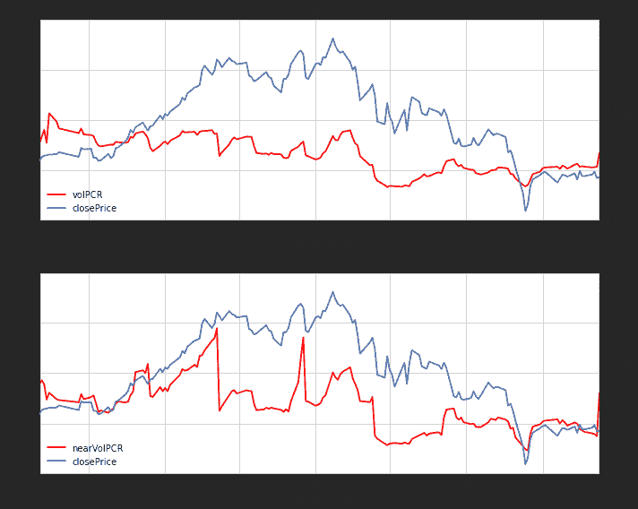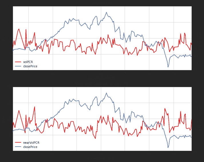 成交量数据图中,上图为全体期权的成交量PCR,下图为近月期权的成交量PCR:
