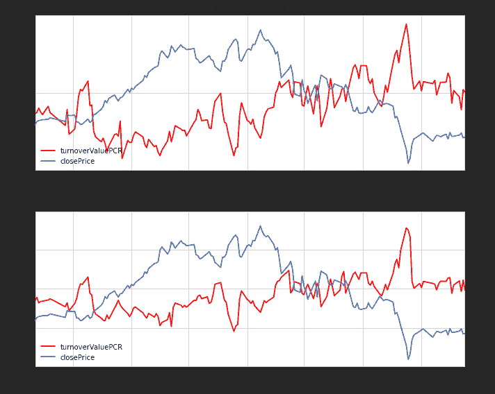 成交额数据图中,上图为全体期权的成交额PCR,下图为近月期权的成交额PCR: