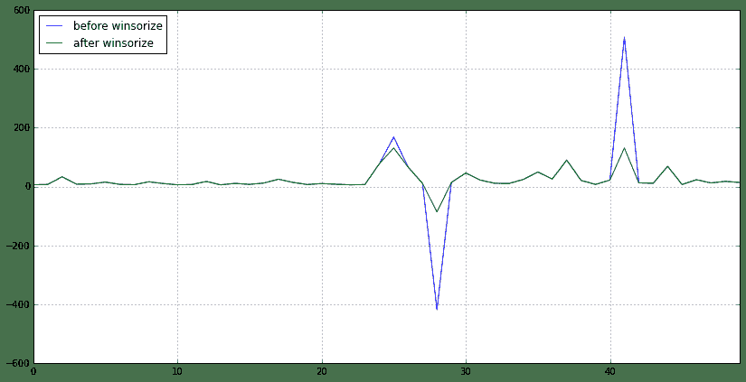 下面绘制一个对比图可以更明显看到winsorize前后数据的变化