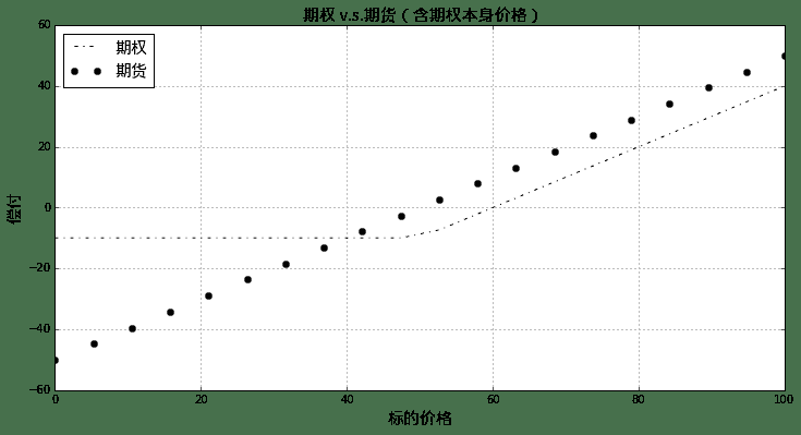 pylab.title(u'期权 v.s.期货(含期权本身价格)', fontproperties = font)