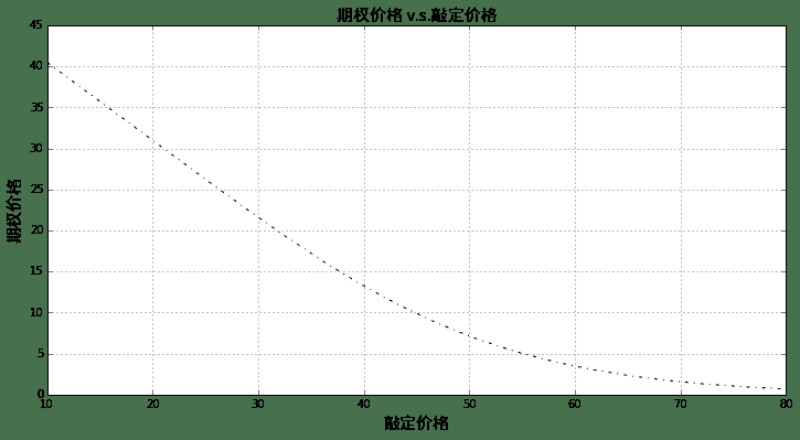 pylab.title(u'期权价格 v.s.敲定价格', fontproperties = font)