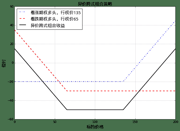 pylab.legend([u'看涨期权多头,行权价135',u'看跌期权多头,行权价65',u'异价跨式组合收益'], prop = font, loc = 'best')