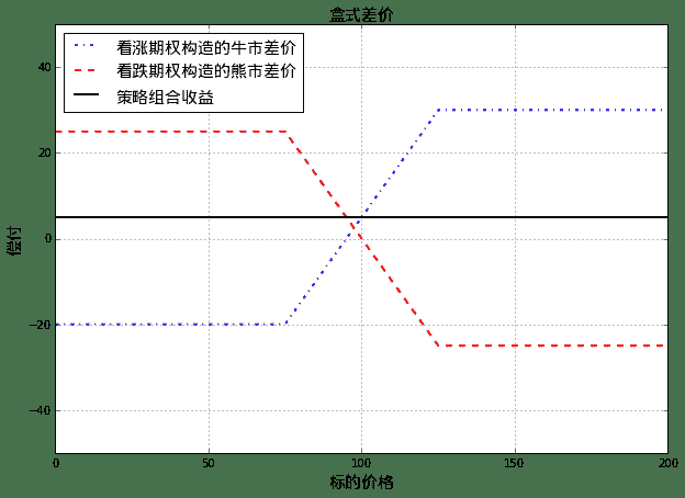 pylab.title(u'看涨期权构造的牛市差价策略', fontproperties = font)