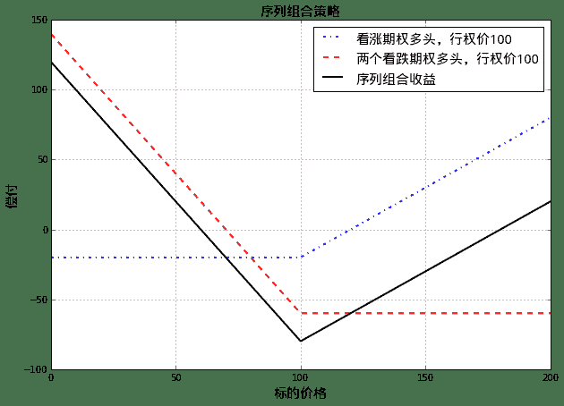 pylab.legend([u'看涨期权多头,行权价100',u'两个看跌期权多头,行权价100',u'序列组合收益'], prop = font, loc = 'best')