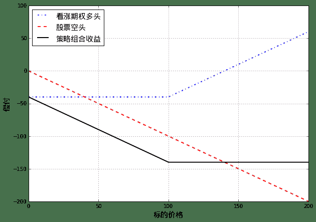pylab.legend([u'看涨期权多头',u'股票空头',u'策略组合收益'], prop = font, loc = 'best')