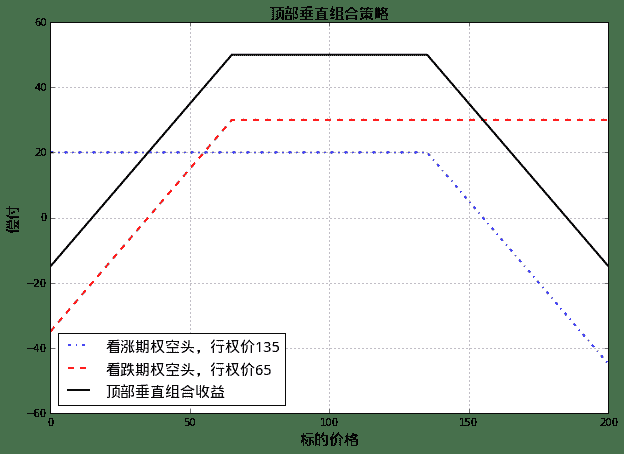 pylab.legend([u'看涨期权空头,行权价135',u'看跌期权空头,行权价65',u'顶部垂直组合收益'], prop = font, loc = 'best')