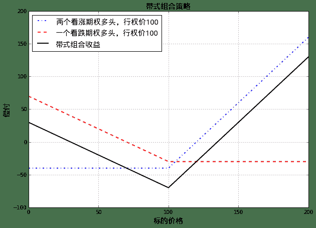 pylab.legend([u'两个看涨期权多头,行权价100',u'一个看跌期权多头,行权价100',u'带式组合收益'], prop = font, loc = 'best')