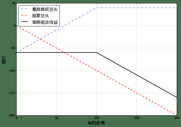 pylab.legend([u'看跌期权空头',u'股票空头',u'策略组合收益'], prop = font, loc = 'best')