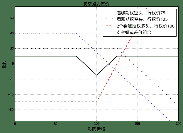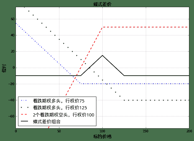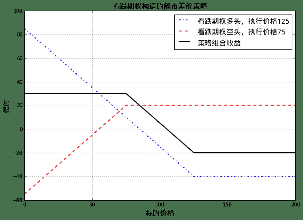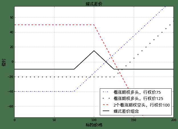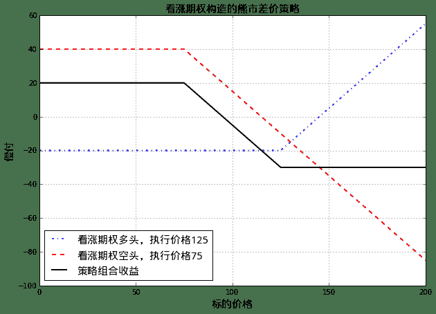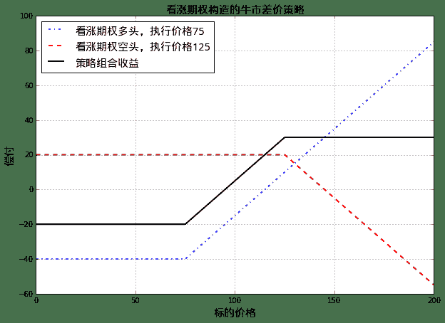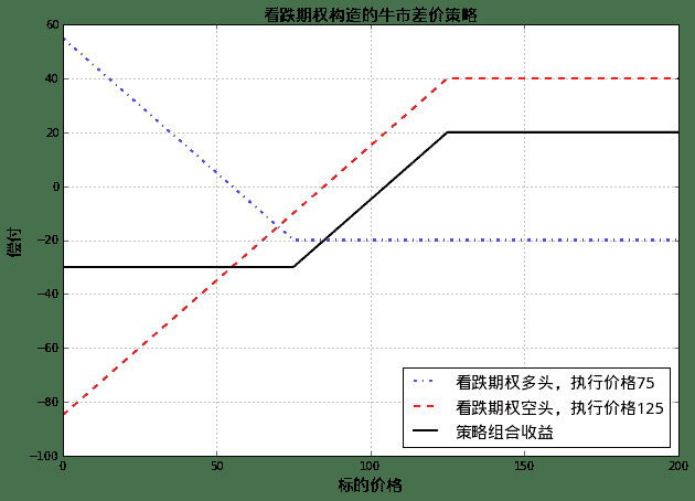 pylab.legend([u'看涨期权多头,执行价格75',u'看涨期权空头,执行价格125',u'策略组合收益'], prop = font, loc = 'best')