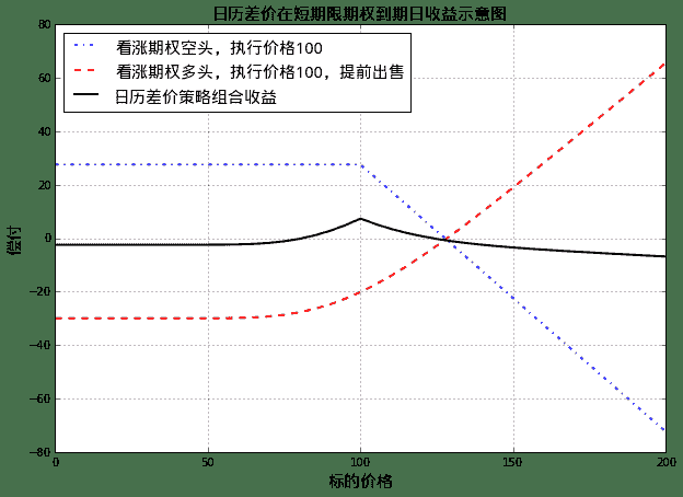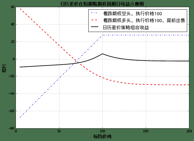 pylab.legend([u'看跌期权空头,执行价格100',u'看跌期权多头,执行价格100,提前出售',u'日历差价策略组合收益'], prop = font, loc = 'best')