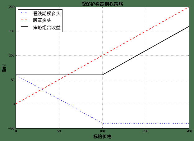 pylab.legend([u'看跌期权多头',u'股票多头',u'策略组合收益'], prop = font, loc = 'best')