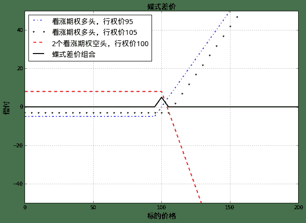 pylab.legend([u'看涨期权多头,行权价95',u'看涨期权多头,行权价105',u'2个看涨期权空头,行权价100', u'蝶式差价组合'], prop = font, loc = 'best')