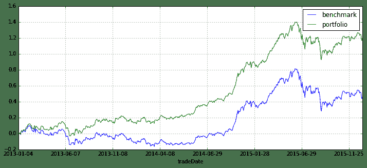 data['portfolio'] = data['benchmark'] + 0.001 # 每天跑赢基准0.1%