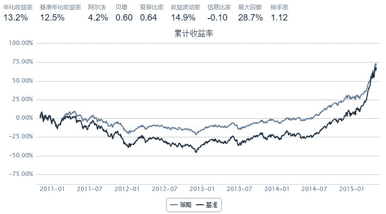 上图显示, 从绝对收益角度来看,周转率选股模型在 2011 年 11 月至 2013 年 4月这三期当中绝对收益为负; 2011 年 5~10 月,虽然整体市场下跌,但模型组合绝对收益为正; 2015 年 5~10 月,市场先扬后抑,但模型组合仍斩获正收益。