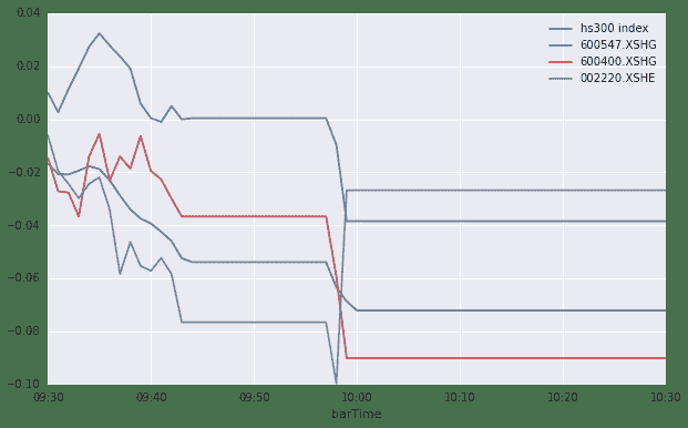 hs300 = DataAPI.MktBarRTIntraDayGet(securityID='399300.XSHE',startTime='09:30',endTime='10:30')