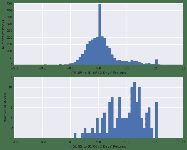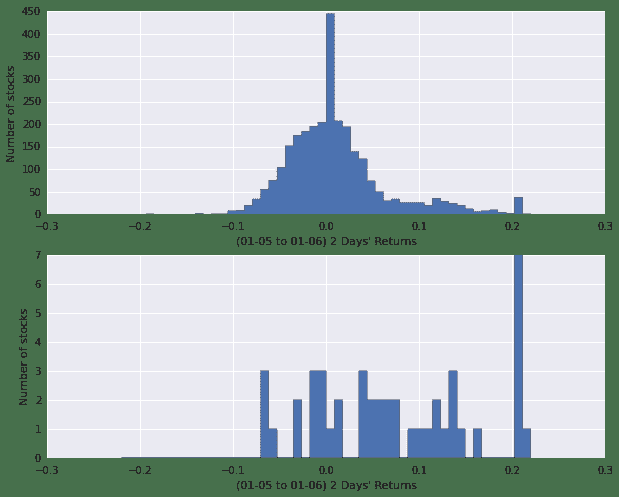 图中,上图为全A股在过去的5、6日两个交易日收益表现分布;下图为我们选出来的今日错杀股在5、6两个交易日的收益表现分布;