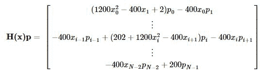 Hp[0] = (1200*x[0]**2 - 400*x[1] + 2)*p[0] - 400*x[0]*p[1]